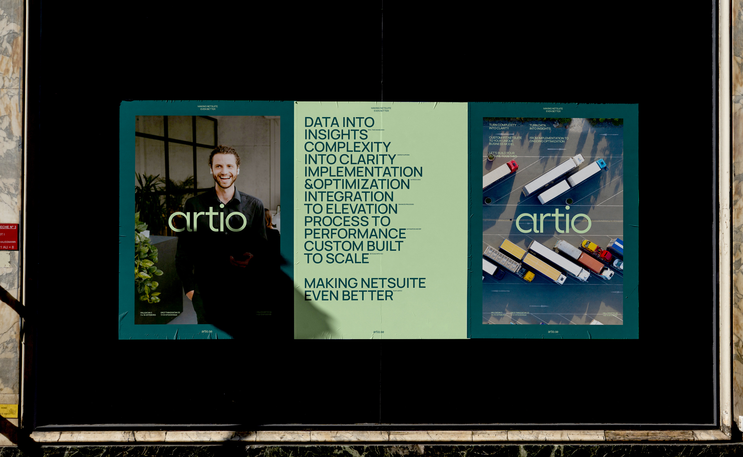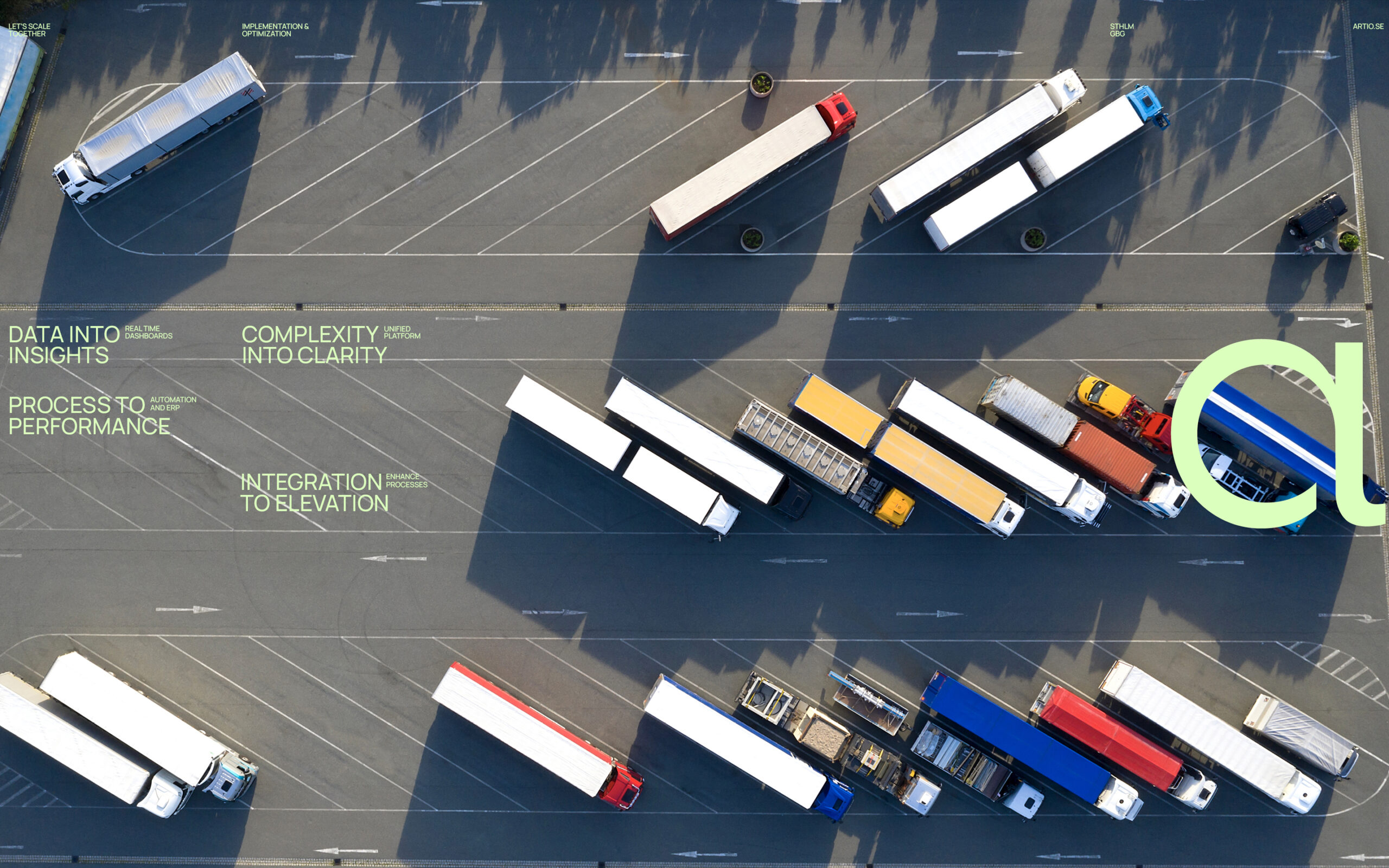 Together with Artio, we focused on defining a brand direction built around the idea of organisation and overview. Inspired by large-scale systems like container yards, airports and logistics flows the visual concept reflects clarity, structure and control.